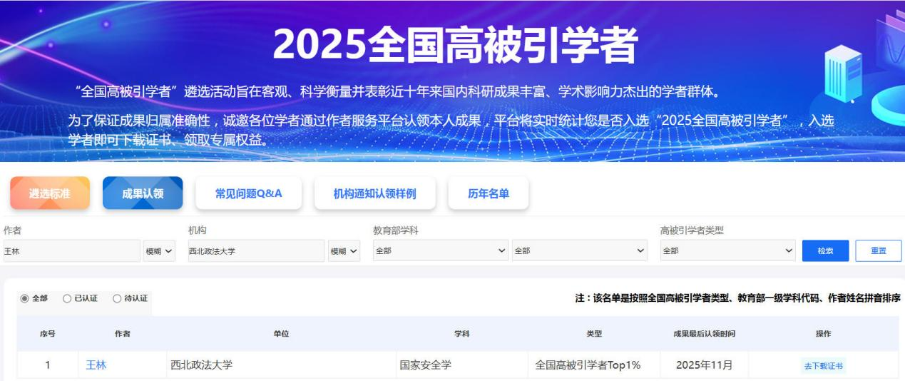 近日,中国知网下属的中国科学文献计量评价研究中心(出版智库)发布“2025全国高被引学者”榜单。舒洪水教授和王林副教授均已连续两年入选“全国高被引学者TOP1%”,体现了学院在法学、国家安全学等研究领域的学术影响力。
